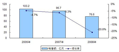 圖1 2006-2008年中國DVD播放機銷售額規(guī)模與增長