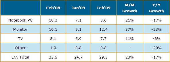 DisplaySearch上海辦公室,2009年3月23日 --- 根據(jù)DisplaySearchy最新關(guān)于全球TFT LCD出貨調(diào)查指出,二月份大尺寸面板出貨量為2千950萬片,較上月大幅成長23%,營收直逼29.5億美元,較上月成長14%,這是自2008年九月份以來首次見到成長的月份。二月份的良好表現(xiàn)主要來自于急單效應與客戶持續(xù)補充庫存,也是TFT LCD產(chǎn)業(yè)即將觸底反彈的信號。