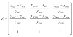 為您的系統(tǒng)設計LED控制機制,面對的是基本的線性代數(shù)。在得到您LED的色度坐標后,您必須先建立一個矩陣,找出所要色彩點之間的delta值,如公式1所示。公式中色彩下標字是LED的顏色,mix下標代表您想要呈現(xiàn)的顏色。