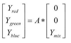 欲找出每個LED應輸出的光通量,可利用逆矩陣,然后乘以想要的光通量輸出,如公式2所示。