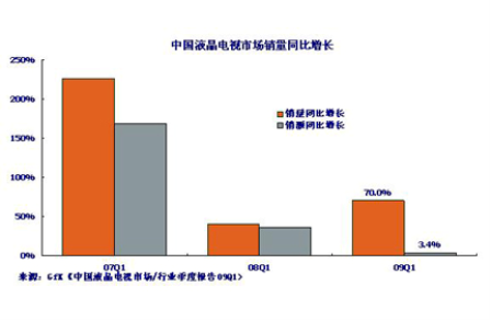 GfK中國發(fā)布的《液晶電視產(chǎn)業(yè)市場季度報(bào)告(09Q1)》顯示:2009年1季度,中國液晶電視市場出現(xiàn)了反彈,銷量達(dá)到476萬臺,比2008年1季度增長了約70%。