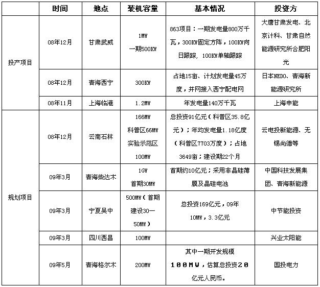 受?chē)?guó)家政策的導(dǎo)向,從2008年底到2009年上半年,全國(guó)上馬了多個(gè)大型并網(wǎng)電站項(xiàng)目,如青海柴達(dá)木的1GW光伏電站項(xiàng)目、青海格爾木的 200MW光伏電站項(xiàng)目、寧夏吳中的500MW光伏電站項(xiàng)目等,盡管目前國(guó)家只批準(zhǔn)了三個(gè)光伏電站項(xiàng)目包括上海崇明島1MW項(xiàng)目、255千瓦的內(nèi)蒙古鄂爾多斯項(xiàng)目和甘肅敦煌的100MW項(xiàng)目,而以上新上馬的項(xiàng)目還有待國(guó)家的批復(fù)。