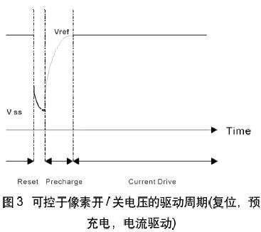 PMOLED彩色顯示要求的驅(qū)動機理和信號互換系統(tǒng)非常復(fù)雜。SSD1338的驅(qū)動器采用復(fù)用的尋址算法,每個驅(qū)動周期由放電(復(fù)位),電壓預(yù)充電和電流驅(qū)動三個階段組成(如圖3所示)。