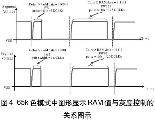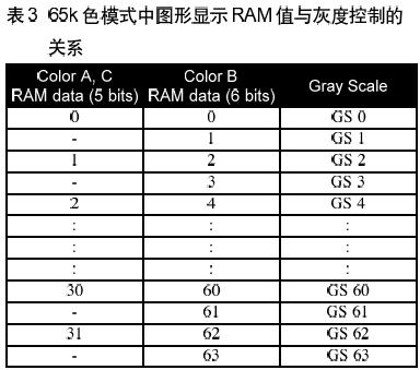 在65K色模式,情形有些不同。如表3所示,從GS0到GS63的64階灰度,有一顏色(顏色B)由6bit組成;而從GS0,GS2,.....到GS62,另外兩個顏色(顏色A和C)只有5-bit,只能呈現(xiàn)32階灰度。
