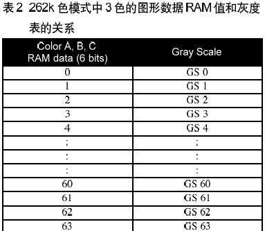 [page]這一單一的灰度表適用于三子色,脈寬的數(shù)值由軟件指令輸入。在262k模式,每一顏色包含6-bit,因在262k模式,每一顏色包含6-bit,因此每一顏色都有64階灰度(如表2所示)。