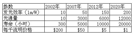 固態(tài)光源OLED目前正處在長(zhǎng)期研發(fā)中,美國(guó)的技術(shù)進(jìn)程詳情可見(jiàn)下表