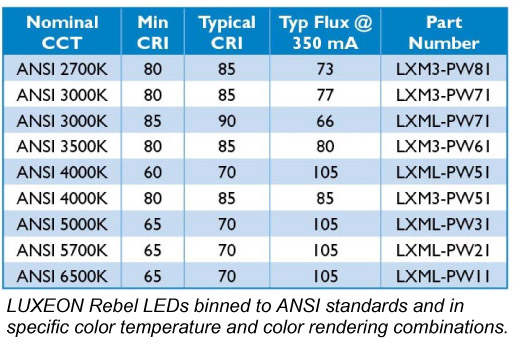 這九款新的LUXEON Rebel LED產(chǎn)品根據(jù)美國國家標準化組織(ANSI)的標準進行電阻分檔,均達到了最低規(guī)定演色系數(shù)。每一款產(chǎn)品的光輸出和光通維持率均達到了ENERGY STAR®和其他光效標準。另外,新產(chǎn)品也具備其他LUXEON Rebel系列產(chǎn)品所公認的高效,長使用壽命及高可靠性的特點。