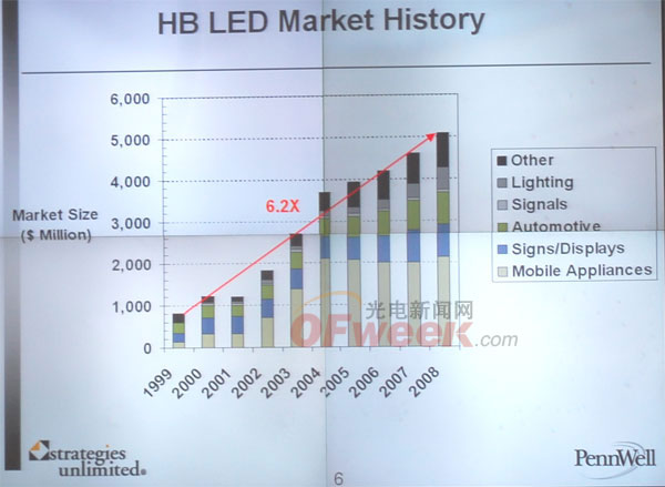 2009年LED持續(xù)擴(kuò)大其在niche和通用照明領(lǐng)域的滲透率,2008年增長(zhǎng)55%,2009年由于受經(jīng)濟(jì)衰退的影響估計(jì)將增長(zhǎng)15%。