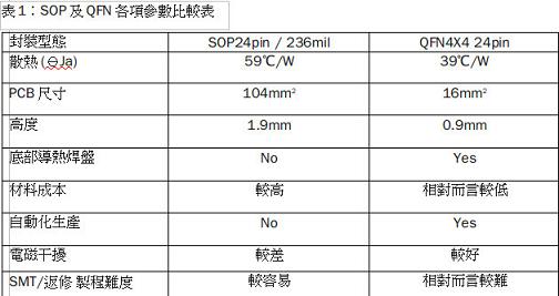 一般在使用的SOP其尺寸為104mm2(8X13x1.9mm),而QFN相對的尺寸只有16mm2(4X4X0.9mm)只有SOP的6~7分之一的尺寸;在做一些小間距的顯示屏設計上具有更大的彈性。