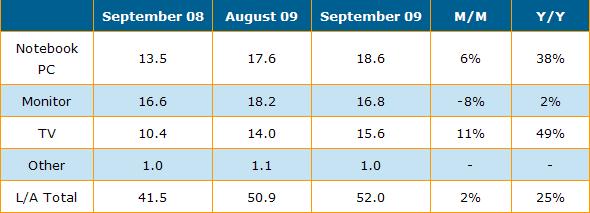 盡管桌上型液晶顯示器面板出貨較上月下滑8%,出貨量?jī)H為1千6百萬(wàn)片,同時(shí)這也是桌上型液晶顯示器用面板出貨自今年2月份以來(lái)首次呈現(xiàn)下滑狀態(tài),然而全球大尺寸液晶面板仍較上月增長(zhǎng)。9月份三星(Samsung)在可攜式電腦(包括筆記本電腦與上網(wǎng)本)用面板方面出貨總數(shù)超過(guò)5百萬(wàn)片,這也是首次單月份可攜式電腦用面板出貨最高紀(jì)錄。