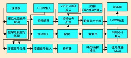 液晶高清數(shù)字電視通常由數(shù)字電視接收通道、模擬電視接收通道、音頻信號(hào)處理放大通道、視頻信號(hào)輸入處理及顯示輸出通道、微控制系統(tǒng)以及電源系統(tǒng)組成。