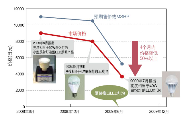 2008年,夏普公司以低價(jià)策略進(jìn)軍LED照明市場(chǎng)。2009年6月,該公司發(fā)布了一款全新的LED燈泡,其市場(chǎng)價(jià)格約4000日元,僅為同類競(jìng)爭(zhēng)產(chǎn)品的一半,推出后立即在市場(chǎng)上掀起了一股強(qiáng)勁的沖擊波。夏普公司的這款低價(jià)產(chǎn)品迫使東芝照明技術(shù)于2009年7月推出亮度相當(dāng)于60W白熾燈的LED燈泡,其廠商建議零售價(jià)約為5000日元,市場(chǎng)價(jià)格約為4000日元。與4個(gè)月前東芝推出的同類產(chǎn)品相比,價(jià)格大幅下降了50%(見圖1和表1)。