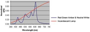 多通道驅(qū)動(dòng)器:就給定的色溫而言,高質(zhì)量CRI(90以上)會(huì)需要多種類型的LED。CRI是光源的光譜能量分布(SPD)的一個(gè)函數(shù)。SPD是指給定波長(頻率)下光源的輻射量。CRI數(shù)值表現(xiàn)最好(97以上)的白熾燈工作壽命較短(750~2500小時(shí)),效率也較低(美國能源部的數(shù)據(jù)為10~17Lm/W)。圖2顯示了白熾燈的SPD曲線與RGB光源曲線的對(duì)比情況。