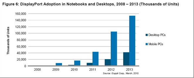 圖為iSuppli公司對于2008-2013年DisplayPort在筆記本電腦和臺式電腦中的占有率的預測。