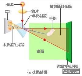 雖然傳統(tǒng)阻抗式薄膜觸控面板結(jié)構(gòu)簡(jiǎn)單、制作成本低廉,不過透明觸控薄膜經(jīng)常曝露在刮傷、破損的操作環(huán)境下。整體來看,使用容易、不需特殊操作工具、不需黏貼特殊膜片,成為新世代多媒體平臺(tái)用大型觸控面板的必備條件,因此研究人員決定採(cǎi)用光學(xué)方式,具體結(jié)構(gòu)是讓雷射二極體的光線在畫面上通行,依此檢測(cè)筆或是手指觸壓位置(座標(biāo)軸)。光學(xué)方式可以分為「檢測(cè)光線反射位置」以及「檢測(cè)光線被遮蔽位置」這兩種方式。
