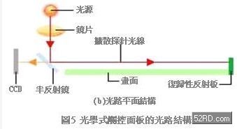 圖5是光學(xué)式觸控面板的光路結(jié)構(gòu),由圖可知,若掌握無法折返光線的角度,理論上就可以輕易求得使用者觸押面板的位置。