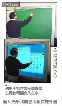 光學(xué)式觸控面板的設(shè)計(jì)必須考量雷射光線對(duì)人眼的安全,因此採(cǎi)用低功率半導(dǎo)體雷射,然而低功率半導(dǎo)體雷射卻會(huì)引發(fā)復(fù)歸光量不足等現(xiàn)象。此外,CCD會(huì)同時(shí)擷取燈泡與太陽等外部光線,必需透過軟體的信號(hào)處理技術(shù)克服。圖6是光學(xué)式觸控面板實(shí)際外觀。一般認(rèn)為,大型光學(xué)式觸控面板非常適合應(yīng)用在教育、運(yùn)動(dòng)以及各種商務(wù)簡(jiǎn)報(bào)等領(lǐng)域。