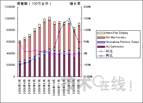 - 2010年3月臺(tái)灣四家大型液晶面板廠商的銷(xiāo)售額環(huán)比增加了9%