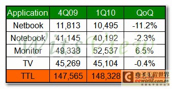根據(jù)市場(chǎng)研究機(jī)構(gòu)WitsView 的統(tǒng)計(jì),2010年第一季全球大尺寸TFT-LCD面板整體出貨,延續(xù)去年第四季的成長(zhǎng)動(dòng)能,總出貨量增加至14,832萬(wàn)片,不斷刷新面板歷史出貨高點(diǎn),更創(chuàng)下連續(xù)五季正成長(zhǎng)的紀(jì)錄。雖然出貨季成長(zhǎng)僅0.5%,但和去年同期相比,亦有高達(dá)71.9%的傲人成長(zhǎng)。