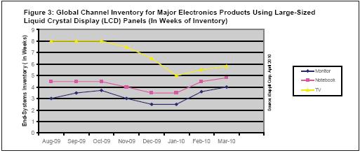 雖然庫存上升,但美國市場上的液晶電視庫存仍保持正常至健康的水平,有利于電視廠商清理舊型號(hào)產(chǎn)品和增加新產(chǎn)品。但是,中國市場的電視渠道庫存現(xiàn)在多于兩周,高于正常水平。這導(dǎo)致出現(xiàn)減少面板訂單的現(xiàn)象,4月面板需求走軟,尤其是來自中國的需求。