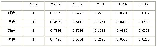 得到了在100%,75.9%,51.2%,22.8%,10.1%,5.9%霧濃度下,四種單色LED的透過率。取三次重復(fù)實驗的平均值,如表2所示。