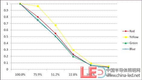 - 在任意濃度下,黃色LED的透過率最大,其次是紅色LED