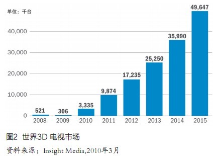 Insight Media市場(chǎng)研究公司3月發(fā)表的最新報(bào)告更加樂觀,預(yù)測(cè)世界3D電視市場(chǎng)將從今年的340萬臺(tái)飚升到2015年的4965萬臺(tái),增長(zhǎng)10倍還多(圖2),屆時(shí)占有率將超過20%。其對(duì)手公司iSupp1i公司尤其樂觀,認(rèn)為同期世界3D電視市場(chǎng)將從420萬臺(tái)竄升到7800萬臺(tái),占有率達(dá)40%,銷售額644億美元。