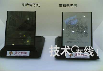 此次三星帶來(lái)了獨(dú)自開發(fā)的塑料和彩色電子紙。塑料電子紙為16階色,彩色電子紙只能顯示4%的NTSC色域,所用材料為塑料,并將門電路集成到塑料基板上,大小為10.1英寸。塑料電子紙和彩色電子紙的厚度分別為0.7mm和0.5mm。據(jù)三星的工作人員介紹,其電子紙均從E ink采購(gòu)電泳層,然后生產(chǎn)出半成品后,銷售給其他電子書廠商。