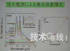 另外,該元件還呈現(xiàn)出如果增加注入電流、發(fā)光強(qiáng)度就會大幅提高的傾向,因此丸泉表示,“如果通過光子結(jié)晶形成共振器構(gòu)造,就應(yīng)該會產(chǎn)生激光振蕩。今后計(jì)劃將發(fā)光波長變更為可用于通信的1.5μm頻帶。將在2~3年后開發(fā)出作為光開關(guān)工作的元件,并實(shí)現(xiàn)實(shí)用化”。