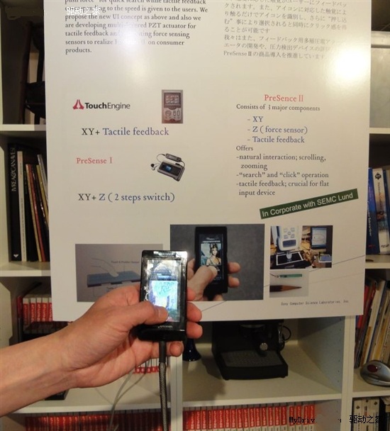 該感壓面板不但能夠偵測到施加到平面方向(X軸、Y軸)的壓力,垂直于該平面的Z軸方向壓力也可偵測到。索尼CSL將該面板集成到了索愛手機上進行演示。根據演示,手機上的圖標轉換速度根據觸摸壓力的不同進行變化,壓力愈大,轉換速度就越快。