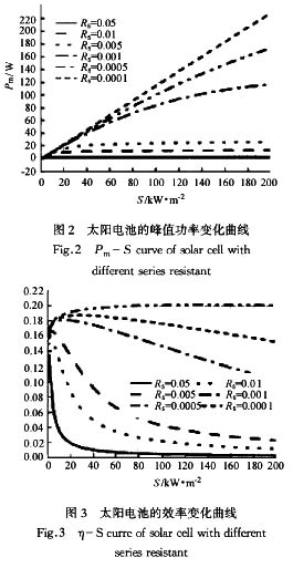 由前面太陽電池的等效電路可以看出,串聯(lián)內(nèi)阻會降低短路電流,降低負載兩端的電壓,引起電池轉(zhuǎn)換效率的下降。圖2和圖3分別為不同串聯(lián)內(nèi)阻的太陽電池峰值功率和轉(zhuǎn)換效率隨光強的變化規(guī)律。從圖中可以看出,隨著光強的增加,串聯(lián)電阻的影響越來越顯著,串聯(lián)內(nèi)阻越高,隨著光強的升高,其轉(zhuǎn)換效率下降的越快。