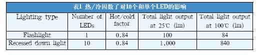 乍一看,16%的LED光通減少量影響可能不大。然而,當(dāng)考慮到一個(gè)照明裝置由多個(gè)LED組成時(shí),這個(gè)問題就嚴(yán)重了。用10個(gè)LED組成的嵌筒燈同一個(gè)LED組成的手電筒比較,熱/冷因數(shù)的影響就顯現(xiàn)出來了。