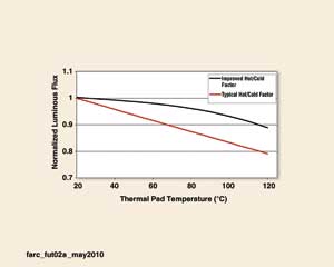 目前,市場上的一些高功率LED的熱/冷因數(shù)為0.94。這意味著LED在100℃條件下工作時(shí),將失去6%的標(biāo)準(zhǔn)光通。圖2給出了典型和改進(jìn)的熱/冷因數(shù)下的光輸出降低函數(shù)。