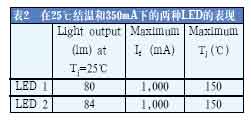 在數(shù)據(jù)表描述的25℃結(jié)溫和350mA的前向電流下,LED2的性能比LED1要好。但是,更實(shí)際的比較將在更高的結(jié)溫下進(jìn)行(見表3)。