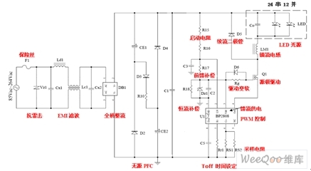 LED光源陣列設(shè)計為0.06W白光LED(SMT或草帽燈)24個串聯(lián)、12串并聯(lián)的方案,驅(qū)動288個小功率WLED,總功率18W。全電壓18WLED日光燈開關(guān)恒流源的設(shè)計電路如圖2所示,其各部分的功能如紅字所標(biāo)注。圖中抗雷擊和EMI濾波組成EMC電路,饋流供電是利用已經(jīng)做在芯片內(nèi)部的整流二極管來實現(xiàn)的。