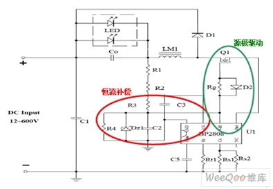 專利的源極驅(qū)動電路由MOS管Q1、D6、Rg、Rt、Rcs與BP2808內(nèi)部電路組成,其顯著特點是有效降低功耗、提高恒流精度。源極驅(qū)動方式的驅(qū)動電路使系統(tǒng)消耗電流減少,尤其是減少了傳統(tǒng)的高壓差供電通路中類似R15-17上的電流,從而降低了功耗,提高了效率。D6、Rg可使開關(guān)開通驅(qū)動變軟,關(guān)斷驅(qū)動保持較強,既改善EMI,又盡量不犧牲效率。與LED光源并聯(lián)的輸出濾波電容C0用以減少LED光源上的電流紋波。