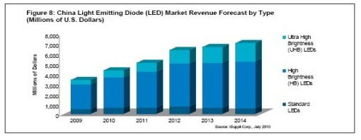 另外,憑借政府的支持和LED日益進(jìn)入液晶電視及普通照明等新的應(yīng)用領(lǐng)域,iSuppli公司預(yù)測,2014年中國LED營業(yè)收入將達(dá)到71億美元,而2009年是34億美元,其間的復(fù)合年度增長率為12.8%。超高亮度(UHB)LED的增長速度更快,到2014年銷售額將從2010年的6.86億美元上升到18億美元,復(fù)合年度增長率為26.9%。