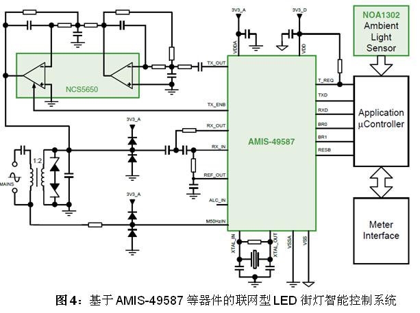 設(shè)計(jì)人員可以采用安森美半導(dǎo)體的AMIS-49587電力線載波(PLC)調(diào)制解調(diào)器、PLC線路驅(qū)動(dòng)器NCS5650和諸如NOA1302這樣的環(huán)境光傳感器,基于電力線輕易地構(gòu)建聯(lián)網(wǎng)型LED街燈智能控制系統(tǒng)(參見(jiàn)圖4)。其中,安森美半導(dǎo)體的環(huán)境光傳感器包含的輸出類(lèi)型,如NOA1302和NOA1305提供的是數(shù)字輸出,而NOA1211為模擬輸出。這些光傳感器的工作電流極低,在100流明光輸出條件下分別僅為58 μA、550 μA和115 μA,因而對(duì)系統(tǒng)能效的影響極小。