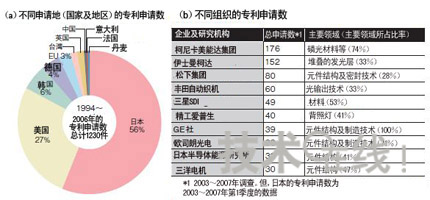 圖日本廠商在開發(fā)方面領(lǐng)先圖為Cintelliq公司就以實現(xiàn)有機EL照明為目的的專利申請數(shù)所做調(diào)查的結(jié)果。按申請地劃分,日本為56%,大大超出排在第2位的美國,遙遙領(lǐng)先(a)。在本圖中,1994~2006年的專利申請數(shù)通過2003年以后的文獻調(diào)查得到。按不同組織劃分,柯尼卡美能達集團為176件,排在第1位(b)。大約3/4的專利與藍色磷光材料有關(guān)。(b)為2003~2007年有機EL照明(包括背照燈)專利按組織劃分的申請數(shù)(前10家公司)及主要領(lǐng)域。由于按組織劃分的日本專利申請數(shù)數(shù)據(jù)中不包含2007年第2季度以后的數(shù)據(jù),因此,實際上日本企業(yè)的申請數(shù)有可能更多。