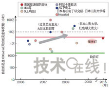 政府機構(gòu)的資助額大多為3年內(nèi)數(shù)億~30億日元的規(guī)模,德國“OPAL(OrganicPhosphorescentlightsforApplicationsintheLightingmarket)”項目為5年內(nèi)1億歐元(約合140億日元),遠遠多于其他項目。在發(fā)光效率方面迅速追趕白色LED有機EL照明雖然具有一些獨特的特點,但考慮到實際影后,還是避免不了在發(fā)光效率、使用壽命、成本等基本性能上與白色LED及現(xiàn)有照明技術(shù)一決高低。近來有機EL照明的性能得到了大幅提高。首先是發(fā)光效率。目前,有機EL照明在研發(fā)水平上比白色LED約落后約2年。2008年6月美國UniversalDisplay(UDC)發(fā)布的“102lm/W”的發(fā)光效率,與2006年3月日本日亞化學工業(yè)發(fā)布的白色LED的發(fā)光效率不相上下。山形大學的城戶表示,“已經(jīng)看到了實現(xiàn)200lm/W的曙光”)。
