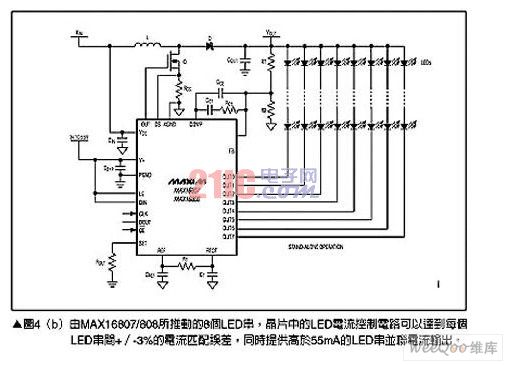 對(duì)于較小型的顯示面板,就可以使用LED矩陣來(lái)取代CCFL背光,不過(guò)使用多個(gè)LED串也會(huì)帶來(lái)相對(duì)的設(shè)計(jì)挑戰(zhàn),其中最明顯的是如何能夠在整個(gè)區(qū)域提供一致的照明與色彩輸出。推動(dòng)LED背光矩陣的一個(gè)方式是采用內(nèi)含8個(gè)LED驅(qū)動(dòng)通道,分別可以提供55mA電流輸出的MAX16807與MAX16808,請(qǐng)參考圖4(a),圖4(b)則顯示了采用MAX16807的典型電路如何簡(jiǎn)化系統(tǒng),只需少數(shù)幾個(gè)元件就能夠完成背光驅(qū)動(dòng)子系統(tǒng)的設(shè)計(jì)。