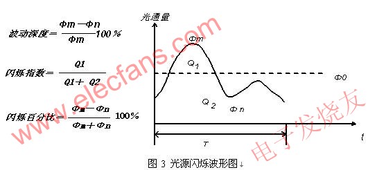 表征光源閃爍強(qiáng)度的參數(shù)波動(dòng)深度、閃爍指數(shù)、閃爍百分比,圖3為典型閃爍波形。圖中,Φm為閃爍波峰值,Φn為閃爍波谷值,Φ0為平均光通量,Q1為Φ0以上部分曲線下的面積,Q2為Φ0以下部分曲線下的面積,T為周期。