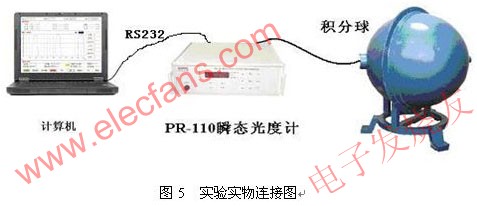 為了精確測(cè)量光通量,把光源放在積分球中。經(jīng)過V(λ)校準(zhǔn)的光電探測(cè)器接受光信號(hào),其輸出的電信號(hào)經(jīng)過放大轉(zhuǎn)換電路,將光電探測(cè)器輸出的光電流信號(hào)轉(zhuǎn)換成較大的電壓信號(hào),利用AD轉(zhuǎn)換器進(jìn)行采樣。由于單片機(jī)讀取和存儲(chǔ)數(shù)據(jù)速度較慢,故而采用了雙口RAM和地址發(fā)生電路,使得光度計(jì)能夠在采用時(shí)自動(dòng)對(duì)數(shù)據(jù)進(jìn)行存儲(chǔ)。單片機(jī)則在所有采樣過程執(zhí)行完畢后,再?gòu)碾p口RAM內(nèi)讀取數(shù)據(jù),并發(fā)送給微機(jī)顯示處理。系統(tǒng)結(jié)構(gòu)圖和實(shí)物連接圖如下。