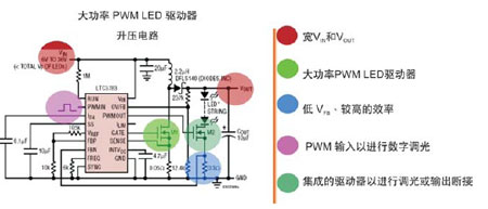 在高電流情況下驅(qū)動LED要求有一個DC/DC控制器,以精確地調(diào)整電流,確保一致的光密度和顏色的統(tǒng)一性,并保護(hù)LED。此外,一個巨大的挑戰(zhàn)是利用電池電壓為一或幾串LED供電,電池電壓可以小于、等于或大于其負(fù)載電壓。另一個考慮是要有效地對大調(diào)光比率的LED進(jìn)行調(diào)光,同時維持其在低和高亮度水平上的色彩特性。此外,DC/DC驅(qū)動器的有效運行是一個關(guān)鍵因素,特別是在驅(qū)動高亮度LED時,因為所有沒有用來照明的功率將成為熱損耗。