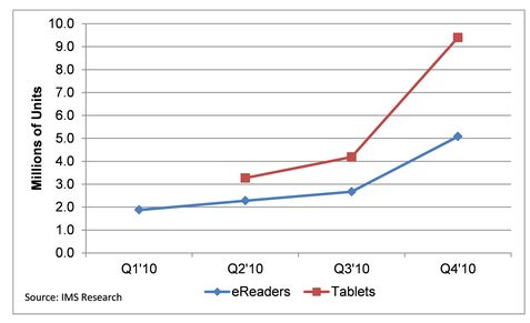 報(bào)告顯示,在2010年的假期中,平板電腦和電子書(shū)閱讀器的市場(chǎng)十分火爆。電子書(shū)閱讀器出貨量在2010年第四季度相比于第三季度增長(zhǎng)了90%,而全年的增長(zhǎng)量為116%,銷量達(dá)到了510萬(wàn)臺(tái),其中亞馬遜的Kindle和Barnes & Noble公司的NOOK成為了最大贏家。