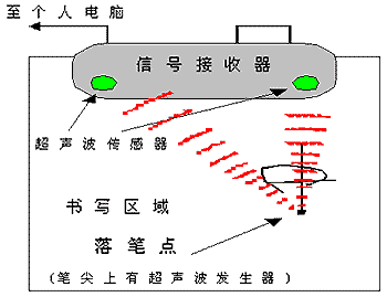 超聲波技術(shù)的原理是:利用超聲波的傳輸速度較慢的特性,根據(jù)超聲波發(fā)射到接收時(shí)間計(jì)算出發(fā)射點(diǎn)到接收點(diǎn)的距離。使用在平面定位上的原理采用的是在屏幕的一邊放置兩個(gè)按固定距離分布的超聲接收裝置,用于定位的筆是一個(gè)超聲波發(fā)射器,當(dāng)筆移動(dòng)在屏幕的表面時(shí),所發(fā)射的超聲波沿屏幕表面被接收器檢測到,由收到超聲波的時(shí)間可以換算出筆與兩個(gè)接收器的距離。采用三點(diǎn)定位的原理,即根據(jù)三角形已知三個(gè)邊長可以確定筆所在的頂點(diǎn)原理,計(jì)算出筆所在的位置坐標(biāo)。是一種測距定位模式。