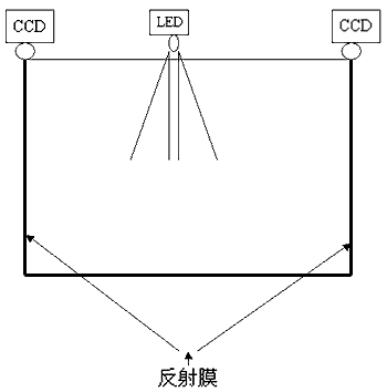CCD光掃描原理是:在顯示區(qū)域的一邊設(shè)置兩個(gè)固定距離的CCD線陣探測器和紅外發(fā)射器,對準(zhǔn)顯示區(qū)域。在顯示區(qū)域的另外三邊設(shè)置可以反射光線的反射膜,在沒有物體阻擋時(shí),線陣CCD檢測到的是一條完整的光帶。當(dāng)有物體在顯示區(qū)域中擋住光線傳播路徑時(shí),在線陣CCD檢測到的光帶中會(huì)出現(xiàn)無反光區(qū)域,分布在兩個(gè)角的CCD分別檢測到的遮擋區(qū)域反應(yīng)在線陣CCD的對應(yīng)區(qū)域,根據(jù)對應(yīng)的區(qū)域計(jì)算出物體在顯示區(qū)域的位置,是一種交叉點(diǎn)測試定位方式。