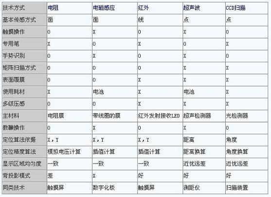 綜上所述,交互式電子白板采用不同的定位方式,則會(huì)有不同的特點(diǎn)和性能。下表將上面的文字內(nèi)容進(jìn)行總結(jié)和對比,相信讀者能分清各種技術(shù)的差異,選擇適合自己的一款產(chǎn)品。