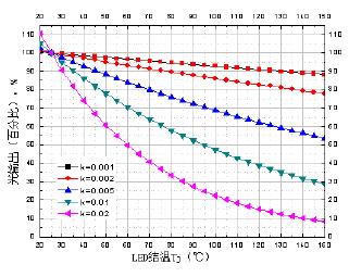 圖2 不同k值LED的光輸出(百分比)隨結溫的變化關系