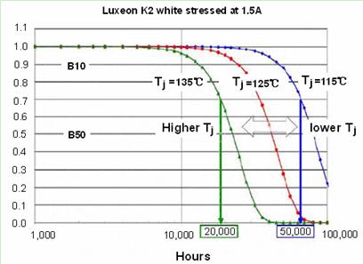 不同品牌LED的光衰是不同的,通常LED廠家會給出一套標準的光衰曲線。例如Philips Lumiled公司的Luxeon K2的光衰曲線如圖1所示,當結溫從115℃提高到135℃,其壽命就會從50,000小時縮短到20,000小時。